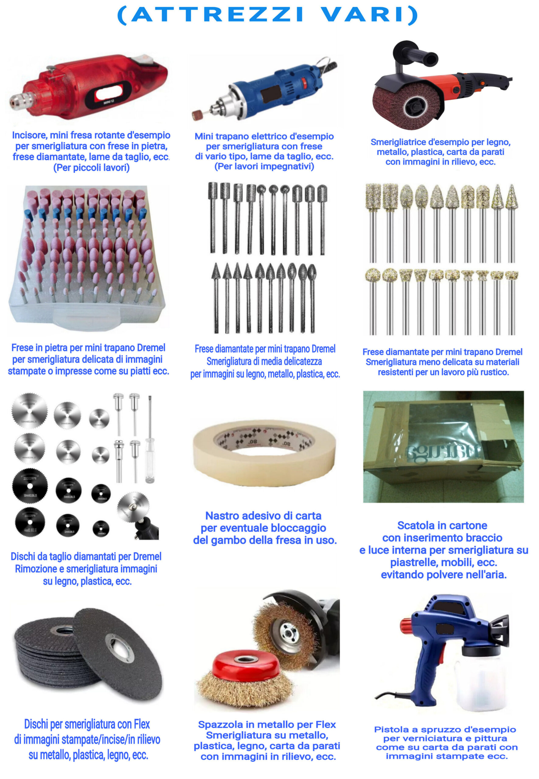 Oltre a questo, lo Spirito di Dio sà perfettamente che l’immagine è stata coperta e non distrutta, essendo presente e vedendola anche sotto la copertura. Per la smerigliatura si può utilizzare uno degli attrezzi a fine documento, se la grandezza dell’immagine lo permette, oppure un arnese diverso, in base al tipo di materiale e al tempo che si vuole dedicare. Nel fare questo è cosa giusta agli occhi di Dio stare attenti a non creare un’altra immagine di tutto ciò che Lui ha creato in cielo e in terra, smerigliando ad esempio una superficie più ampia rispetto all’immagine, trasformandola in qualcosa di diverso, come può essere una figura geometrica.